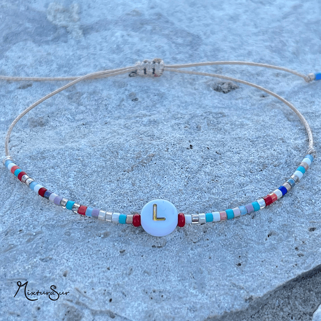 Pulsera realizada con cuentas de vidrio Japonés Miyuki, hilo de seda y letra central.